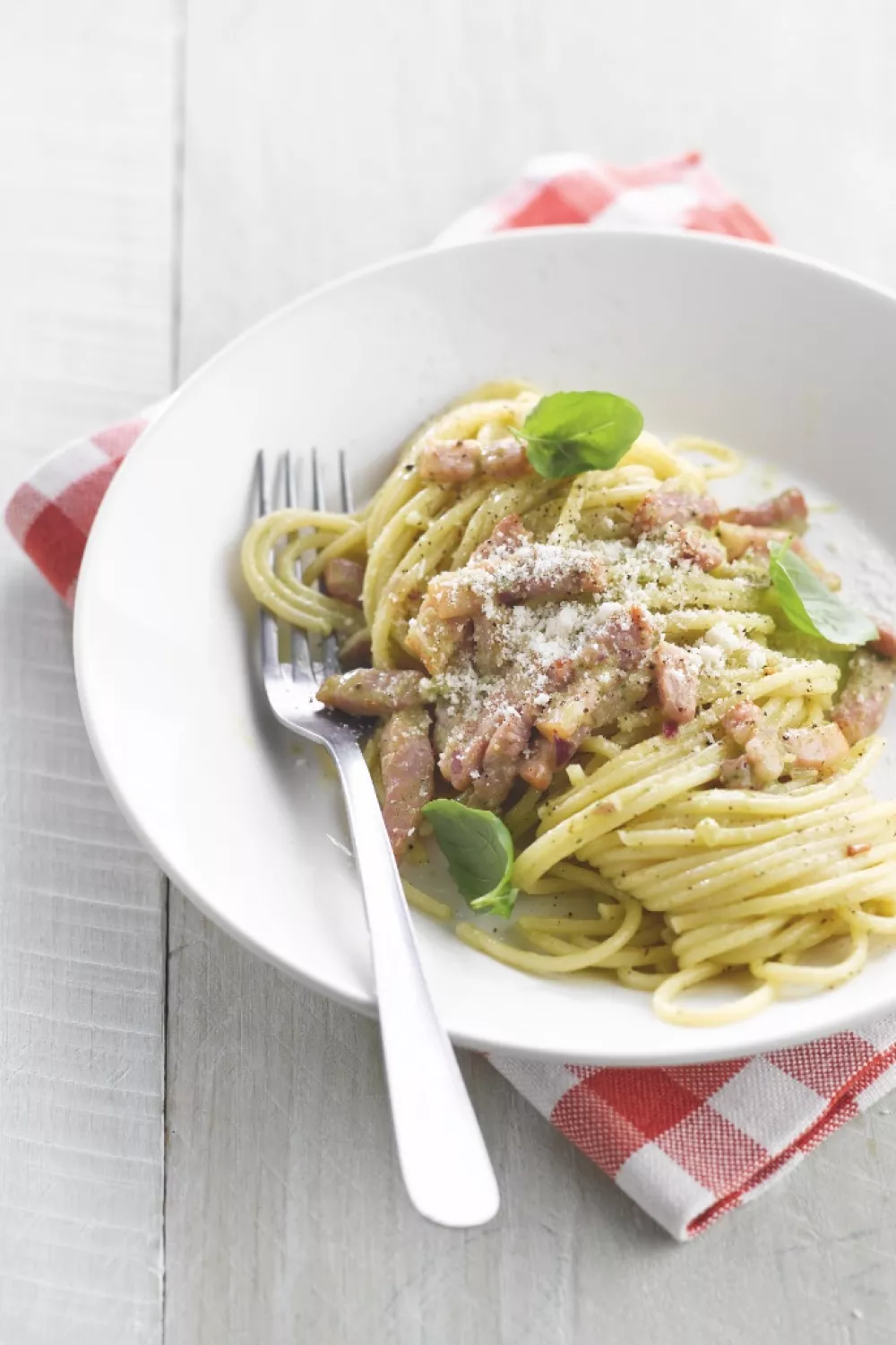 Romige spaghetti carbonara met gerookt spek en een frisse basilicumolie brengt volle room, Parmezaanse kaas en een hint van knoflook samen tot een hartverwarmend Italiaans hoofdgerecht. Door sjalotjes en spek aan te bakken, af te blussen met witte wijn en de saus te binden met room en basilicumolie maak je in enkele stappen een smaakvol comfortgerecht, perfect voor een snelle doordeweekse maaltijd of een zomerse avond.