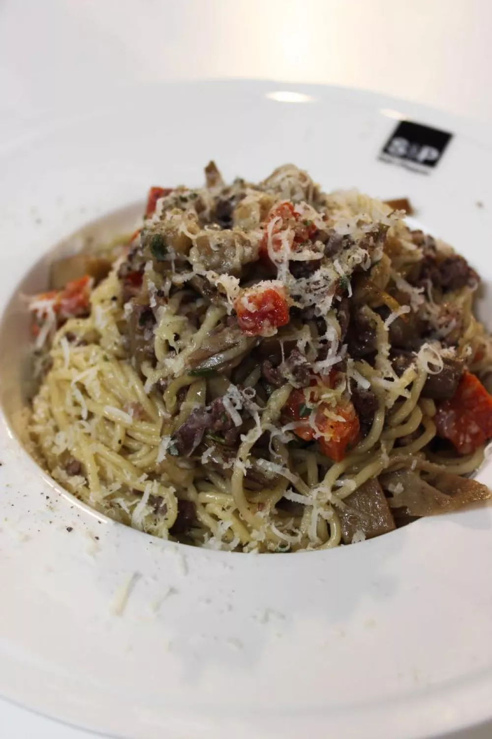 Spaghetti met gehakt, courgette en aubergine
