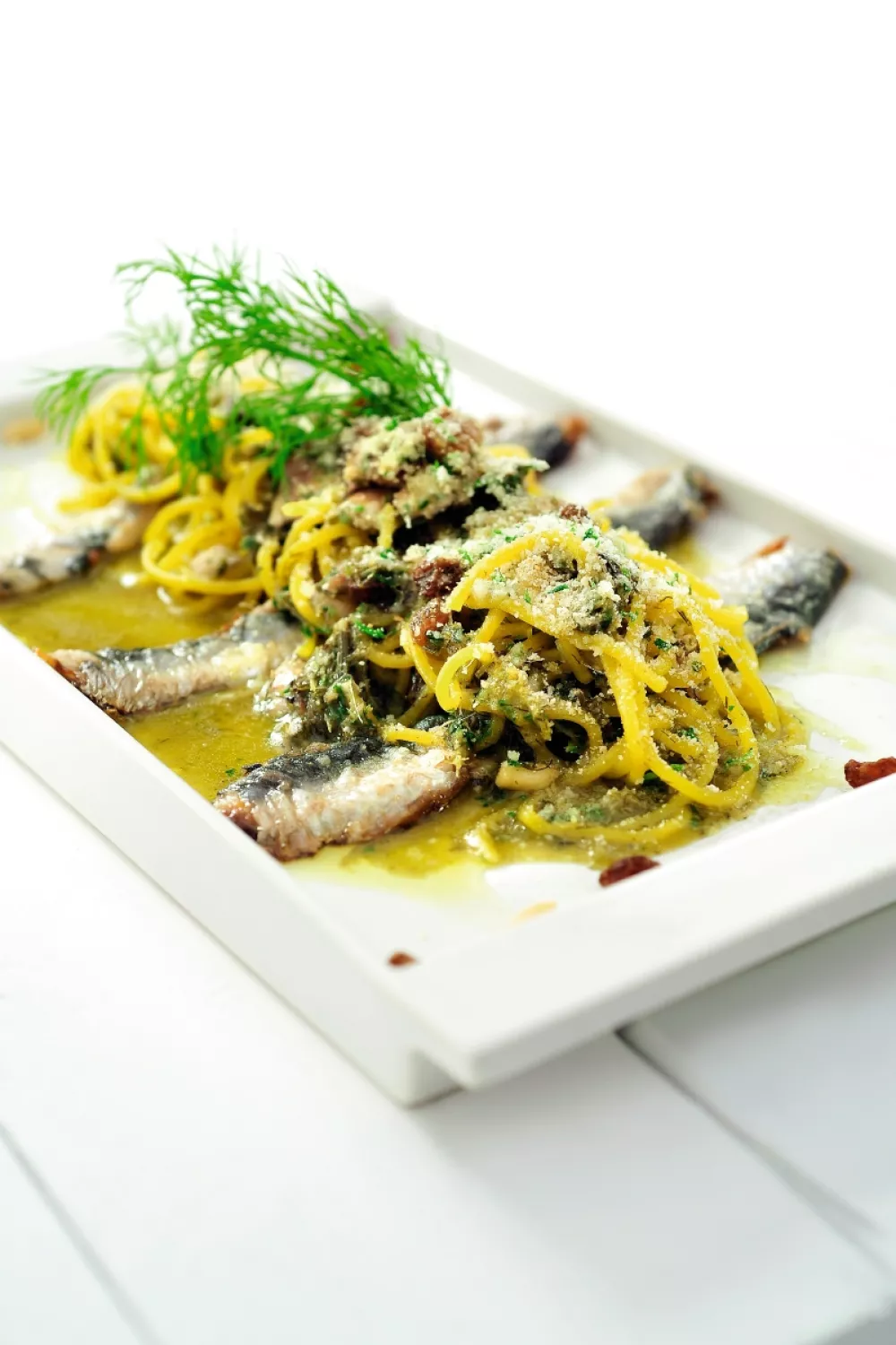Ziltige Siciliaanse spaghetti met verse sardientjes en venkelgroen combineert pijnboompitten, geweekte rozijnen en een scheut witte wijn tot een aromatische mediterrane saus. Zelfgemaakte spaghetti geeft het gerecht een stevige textuur, afgemaakt met geraspte pecorino en krokant paneermeel. Ideaal als zomers visgerecht of sfeervol weekendmaal.