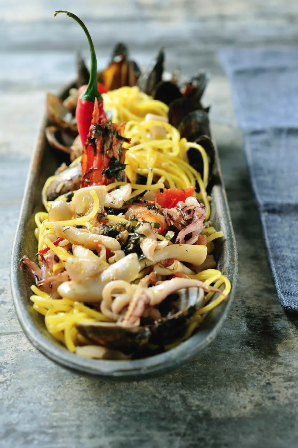 Spaghetti met zeevruchten en peperoncini