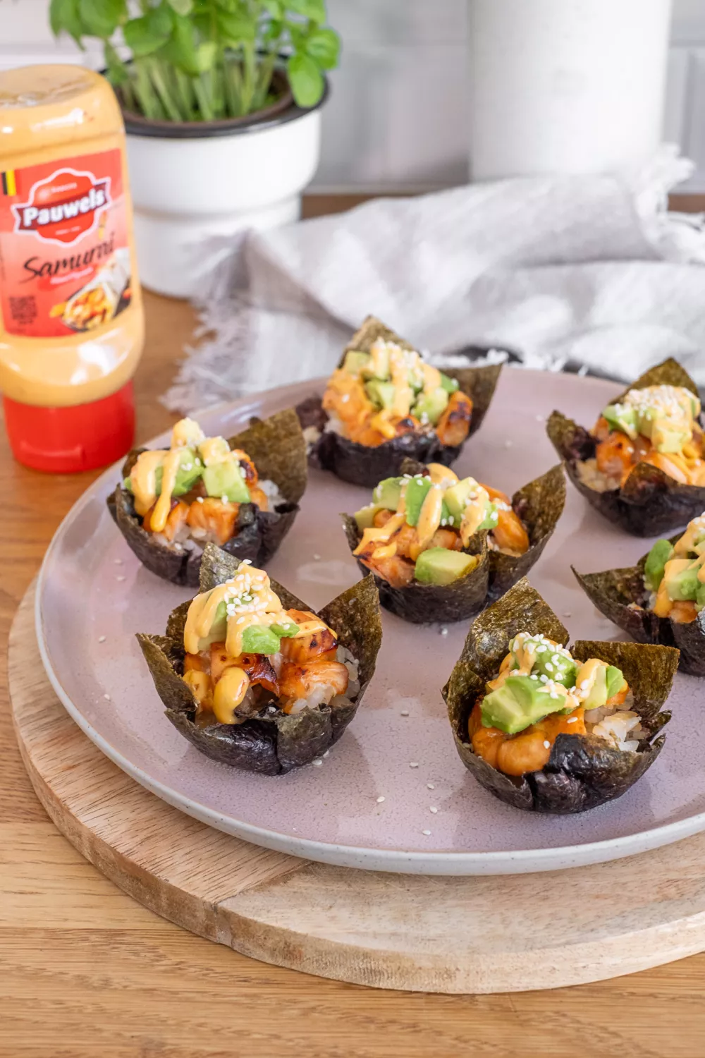 Kleine pittige zalmhapjes met sushirijst, nori en romige avocado, ideaal als borrelhapje of zomers voorgerecht. De zalm wordt kort gemarineerd in sojasaus, honing en samuraisaus en samen met de rijst in een muffinvorm in de oven gebakken voor een krokant randje en zachte structuur. Werk af met extra samuraisaus en sesamzaadjes voor een pittige, Aziatisch getinte smaak.