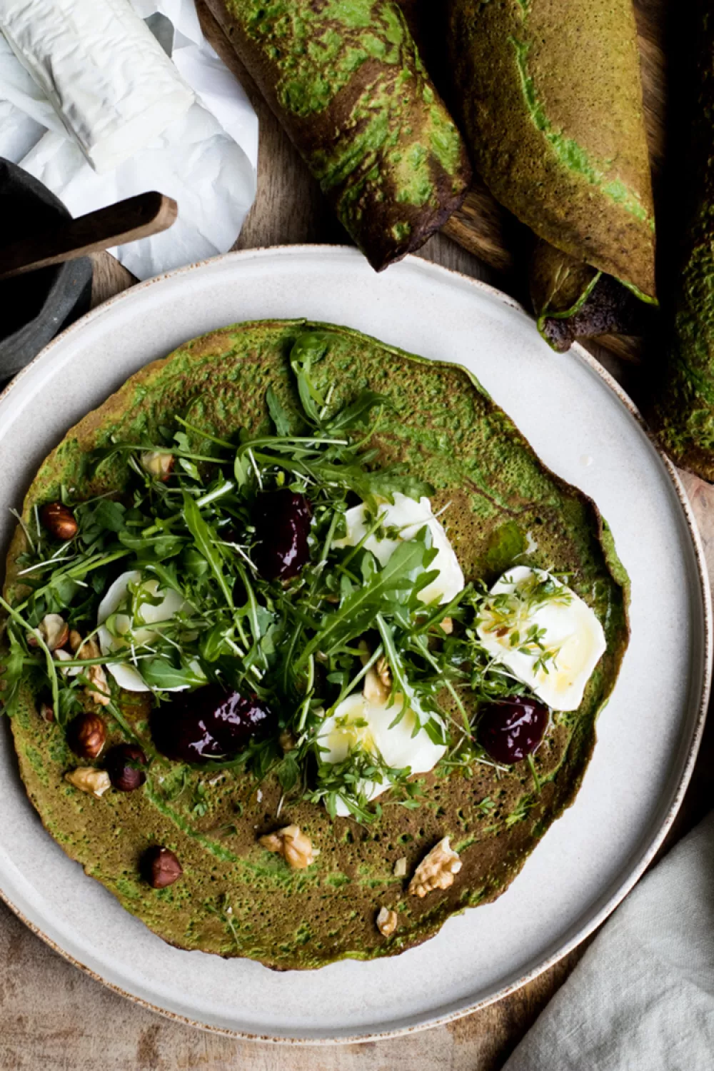 Lichte groene spinaziewraps met romige geitenkaas, pittige rucola en knapperige walnoten zijn perfect als frisse lunch of borrelhap in het voorjaar. Het beslag van verse spinazie, eieren en volkorenmeel wordt in de blender glad gemaakt en in de pan tot dunne wraps gebakken, waarna een vleugje jam zorgt voor een verrassend zoet contrast.
