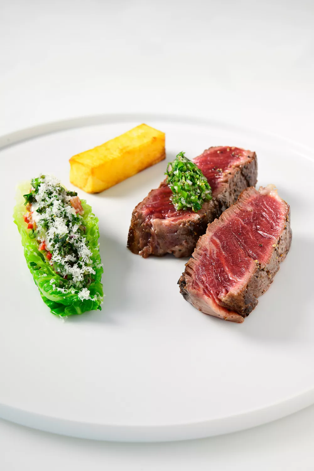Snijd het vlees in plakjes en schik ze mooi op de borden. Serveer met de kropjes sla, de frietjes uit de oven en de rest van de chimichurri.