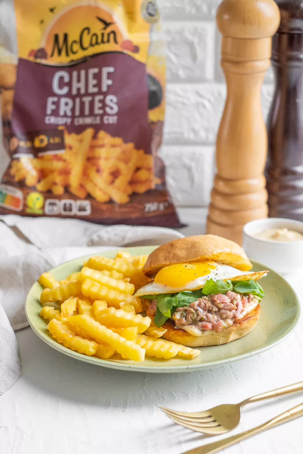 Deze steak tartaar burger combineert fijngehakte rauwe steak met kappertjes, augurkjes en romige truffelmayonaise voor een krachtige, verfijnde smaak. Op een goudgebrande brioche met rucola en een zacht spiegeleitje krijgt elk hapje een volle, smeuïge textuur, terwijl goudbruine frietjes de nodige knapperigheid bieden. Perfect als hartige lunch of weekendgerecht; eenvoudig te bereiden door te hakken, te toasten en te bakken.