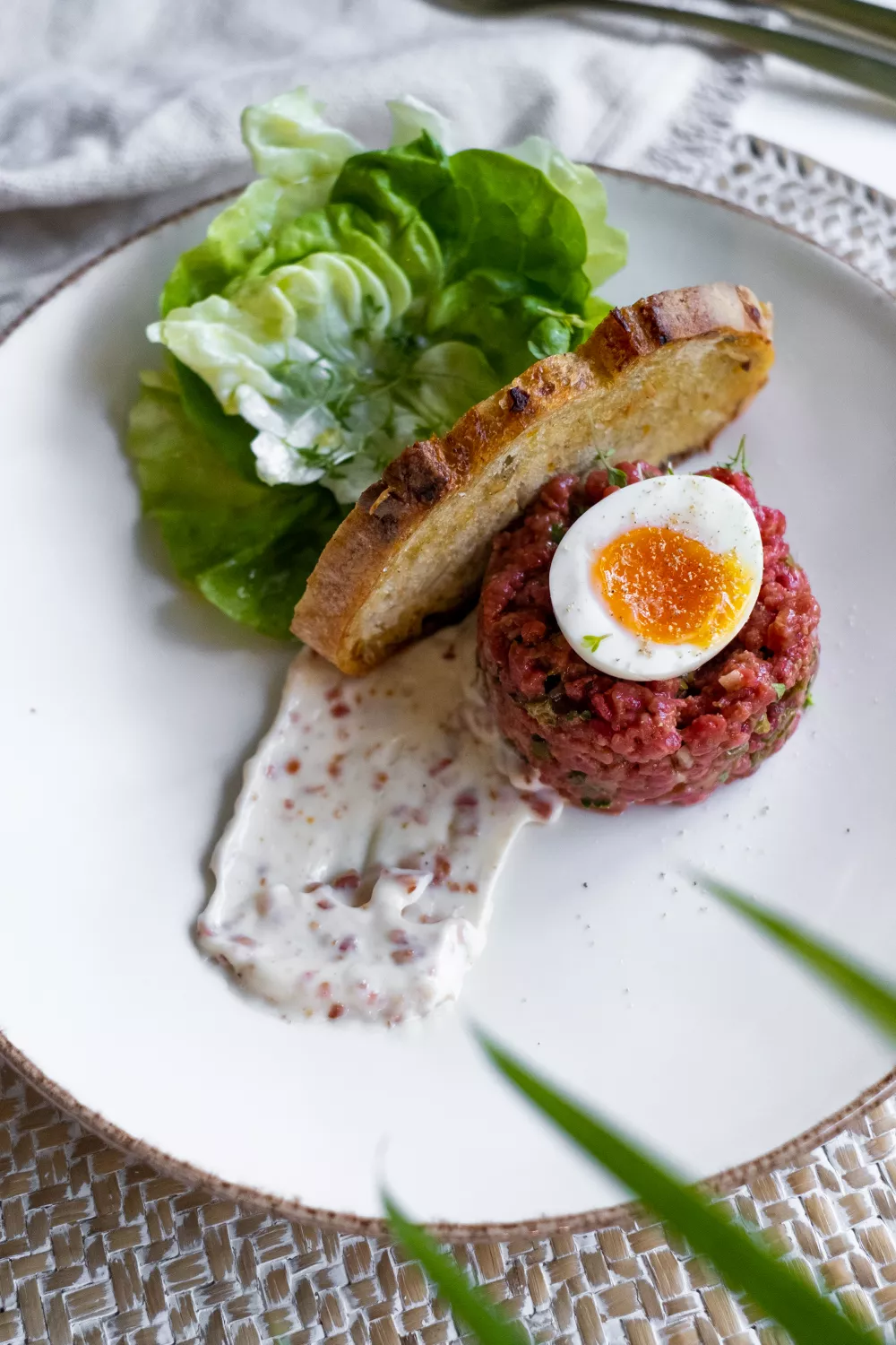 Smeer een laagje van de baconmayo op een bord. Zet er een dresseerring bovenop en vul die met de steak tartaar. Leg er een blaadje sla en een sneetje brood bij. Werk af met een beetje tuinkers en een half eitje.