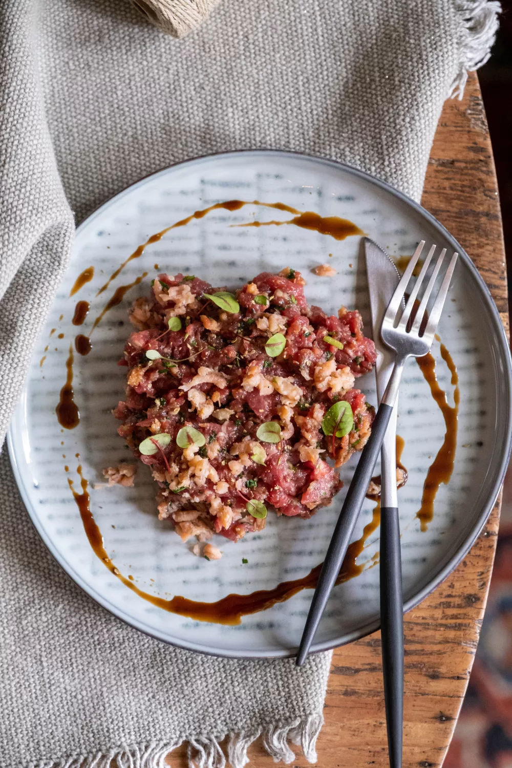 Verdeel de tartaar over bordjes. Werk af met groene kruiden (bv bloedzuring).