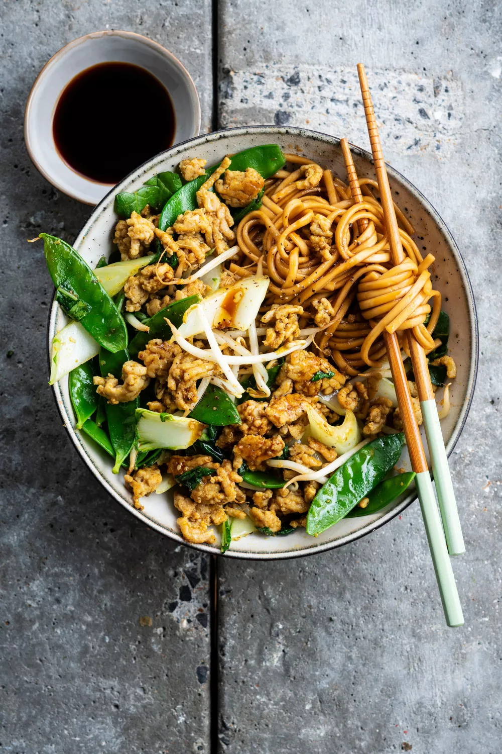 Plakkerige udonnoedels met kruidig gehakt, knapperige paksoi en frisse peultjes vormen een warm Aziatisch geïnspireerd hoofdgerecht vol umami. Kort blancheren en krachtig roerbakken met sojasaus, bruine suiker, gember en gele currypasta zorgt voor een zoetzoute, plakkerige glaze en veel smaak. Ideaal als snel doordeweeks diner of als hartig comfortfood om te delen in elk seizoen.