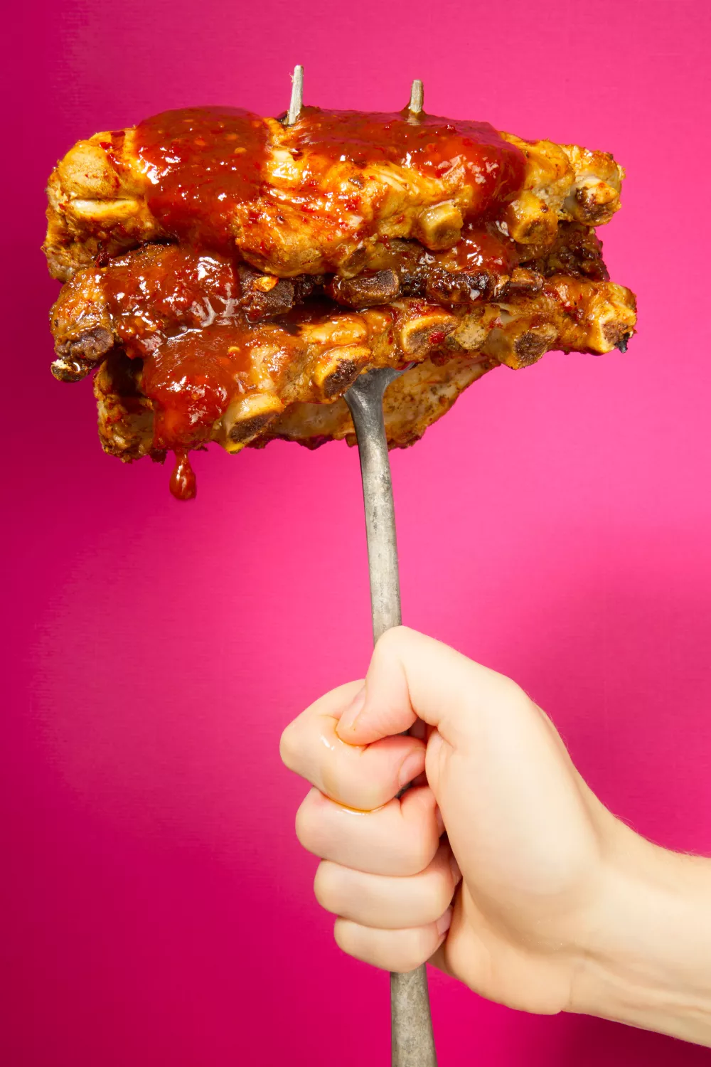 Sticky spicy spareribs met Koreaanse hot sauce geven malse spareribs een kleverige, pittig zoete smaak die op de barbecue licht karamelliseert. De ribben worden eerst zachtjes in water met knoflookpoeder, zwarte peper en zout gepocheerd en daarna royaal ingesmeerd met hot sauce en eventueel wat bruine suiker. Kort grillen zorgt voor rokerige grillstrepen en maakt dit gerecht perfect voor zomerse barbecues of als hartverwarmend comfortfood.
