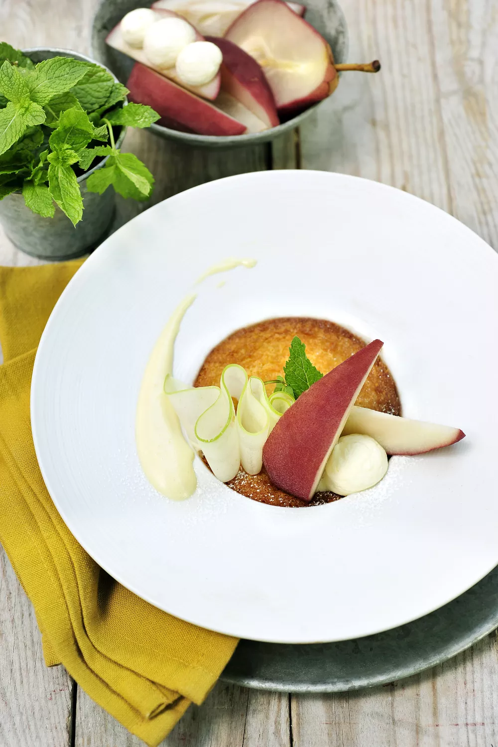 Stoofpeertjes met amandelcrème en sabayon van kaneel