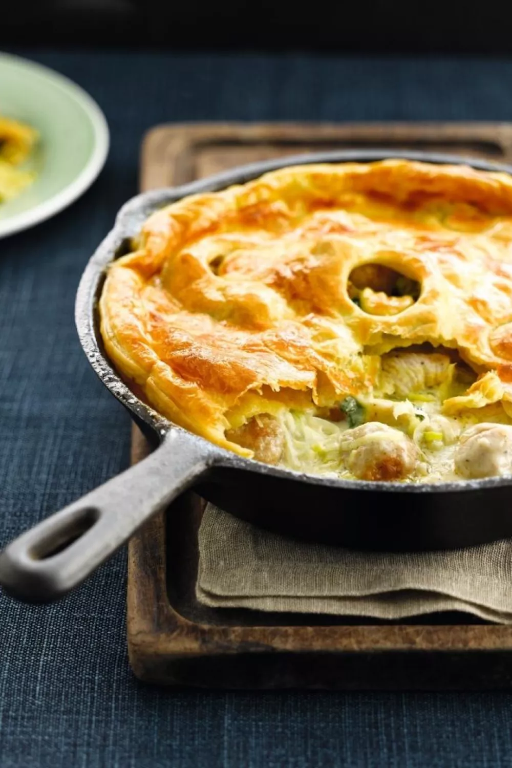 Dit romige stoofpotje van kip met een krokant bladerdeeghoedje combineert zachte prei, sappige kipballetjes en een kruidige kerriesaus voor een hartige, verwarmende smaak. Met een basis van bloem en sojaroom wordt de saus mooi gebonden en afgewerkt met nootmuskaat en verse peterselie voor extra frisheid. Perfect als troostmaaltijd doordeweeks of als gezellige weekendschotel in herfst en winter, waarbij de pan van fornuis naar oven gaat voor die goudbruine afwerking.