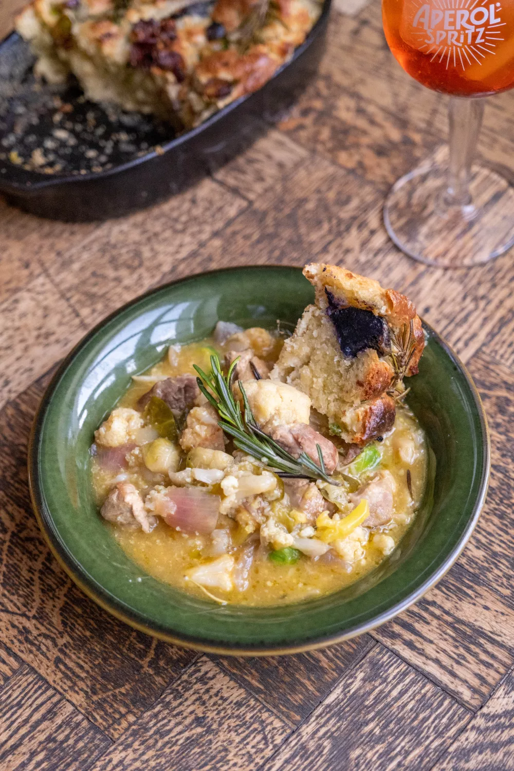 Stoofpotje van varkensspiering met bloemkool, pickles en spek-spruitjesbrood