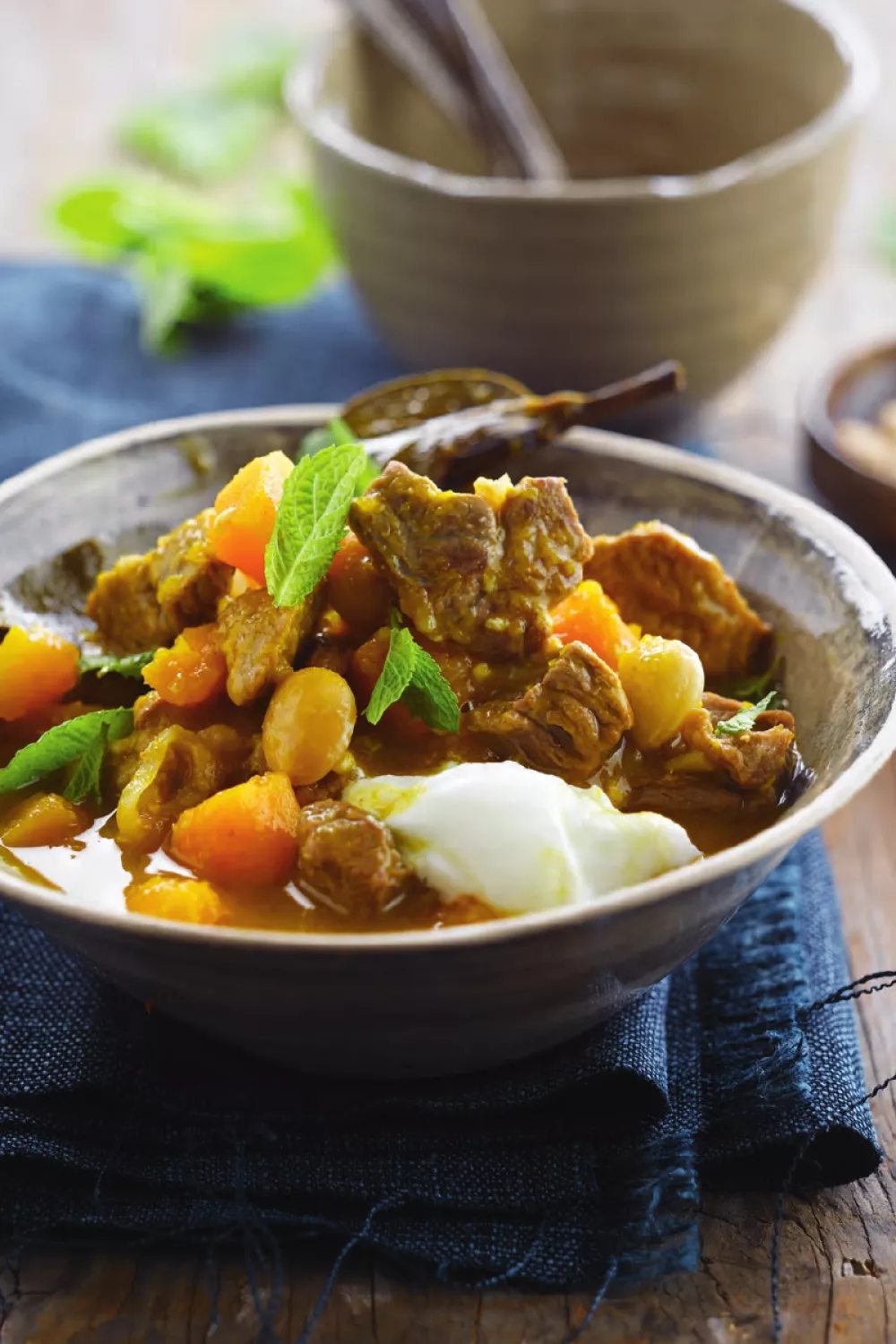 Deze warme stoofschotel met malse lamsblokjes en zoete pompoen brengt comfort op tafel. Kruidige gember, kaneel en garam masala samen met rozijnen en amandelen geven het gerecht een subtiele Oosterse toets, ideaal voor herfstige avonden of een feestelijke familiebijeenkomst. Door het vlees eerst rondom bruin te bakken en vervolgens langzaam te laten stoven en sudderen met yoghurt krijgt de saus een romige, volle smaak.