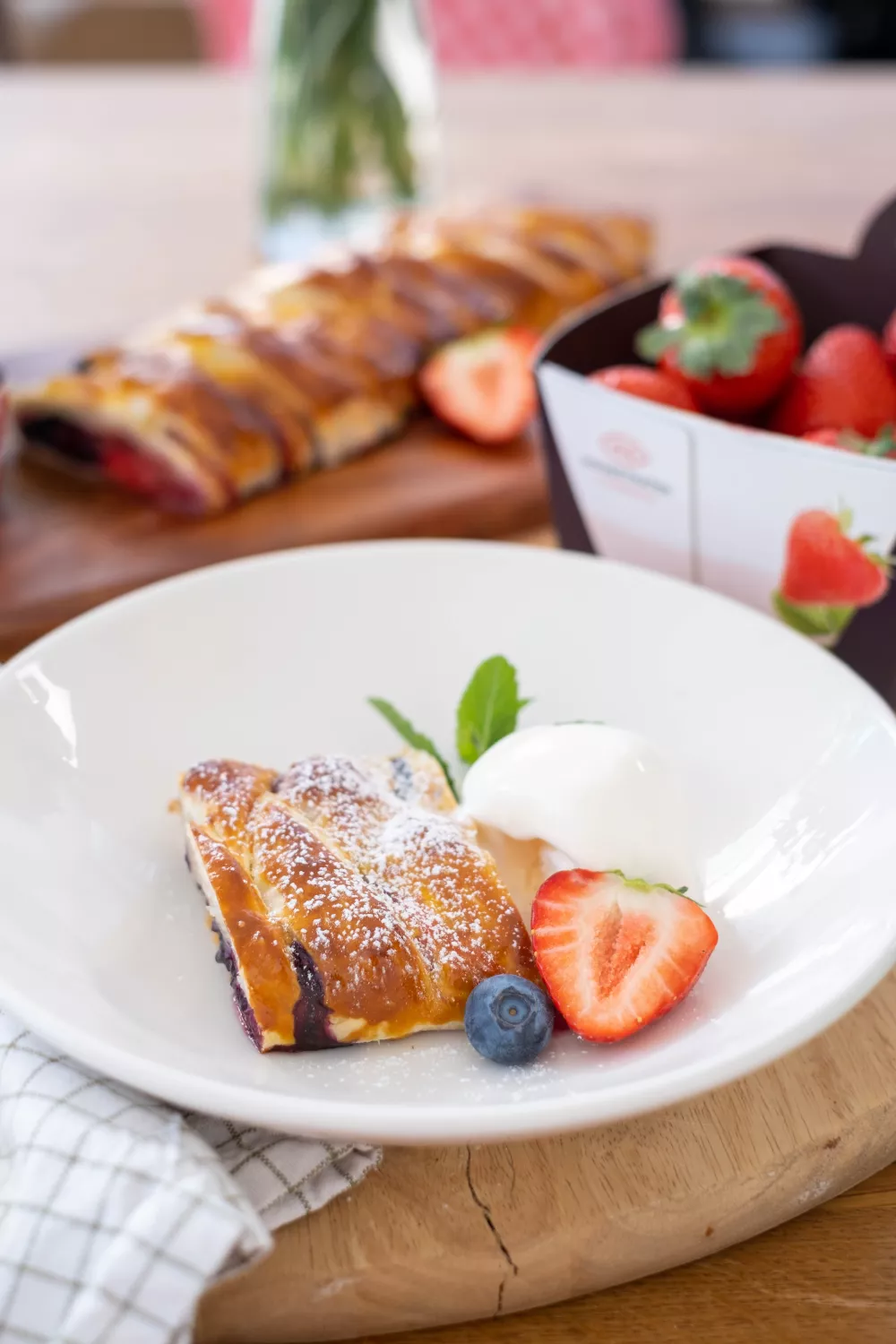 Zoete zomerfruit in een krokante bladerdeegstrudel met sappige Hoogstraten aardbeien en blauwe bessen, op smaak gebracht met frisse sinaasappelzeste. Je vlecht het deeg over het fruit voor een elegante, ambachtelijke touch en bakt de strudel goudbruin voor een warm, huiselijk dessert. Serveer met een bolletje vanille ijs bij brunch, koffie of als feestelijke afsluiter.