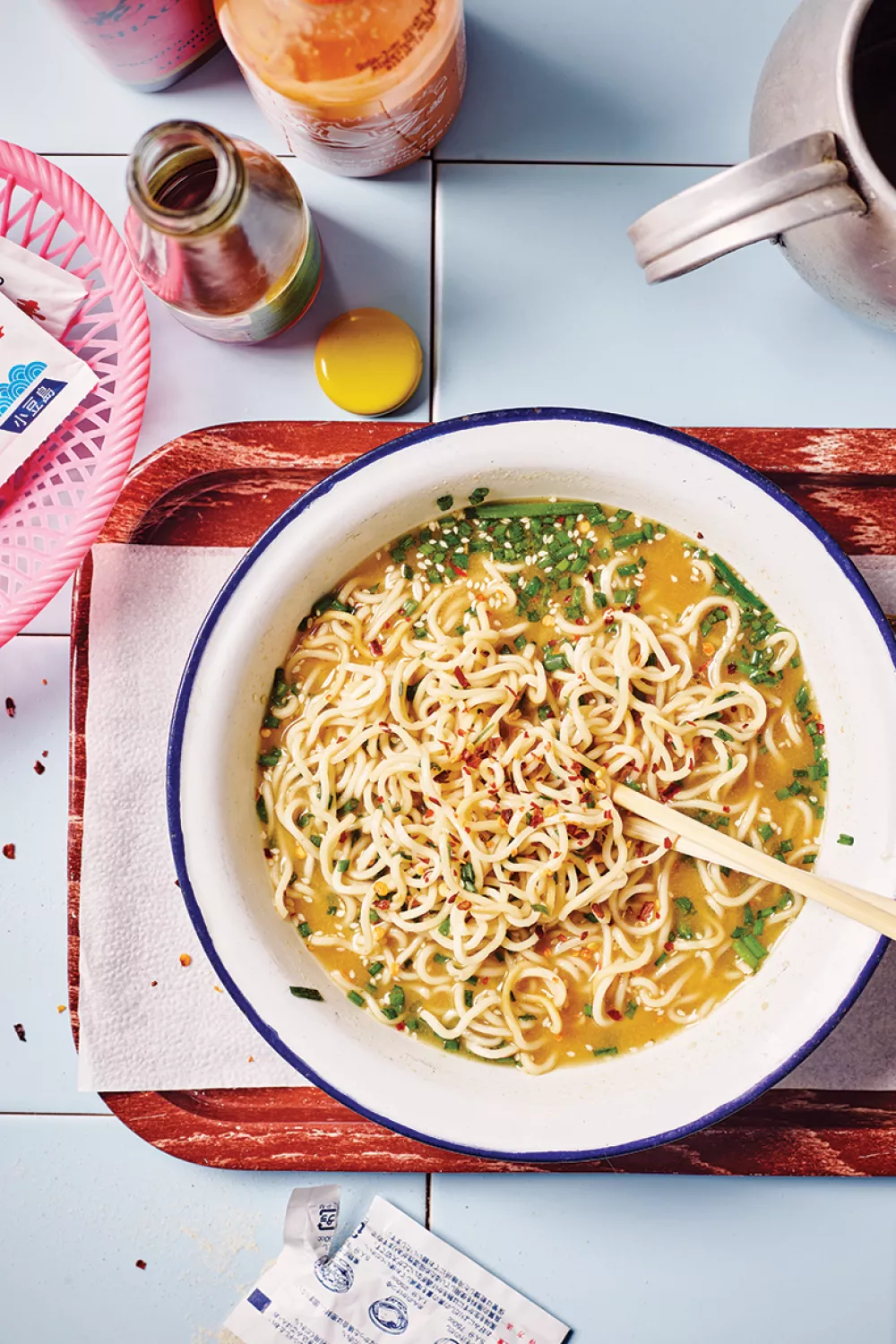 Romige pindakaasnoedels met een pittige touch van chilisaus en chiliolie zijn een snelle, Aziatisch geïnspireerde comfortmaaltijd voor drukke doordeweekse avonden. Bieslook, sesamzaadjes en een scheut kippenbouillon geven umami en textuur, terwijl een vleugje limoensap het geheel fris maakt. Kook en meng in enkele minuten voor een warme lunch of avondmaal in elk seizoen.