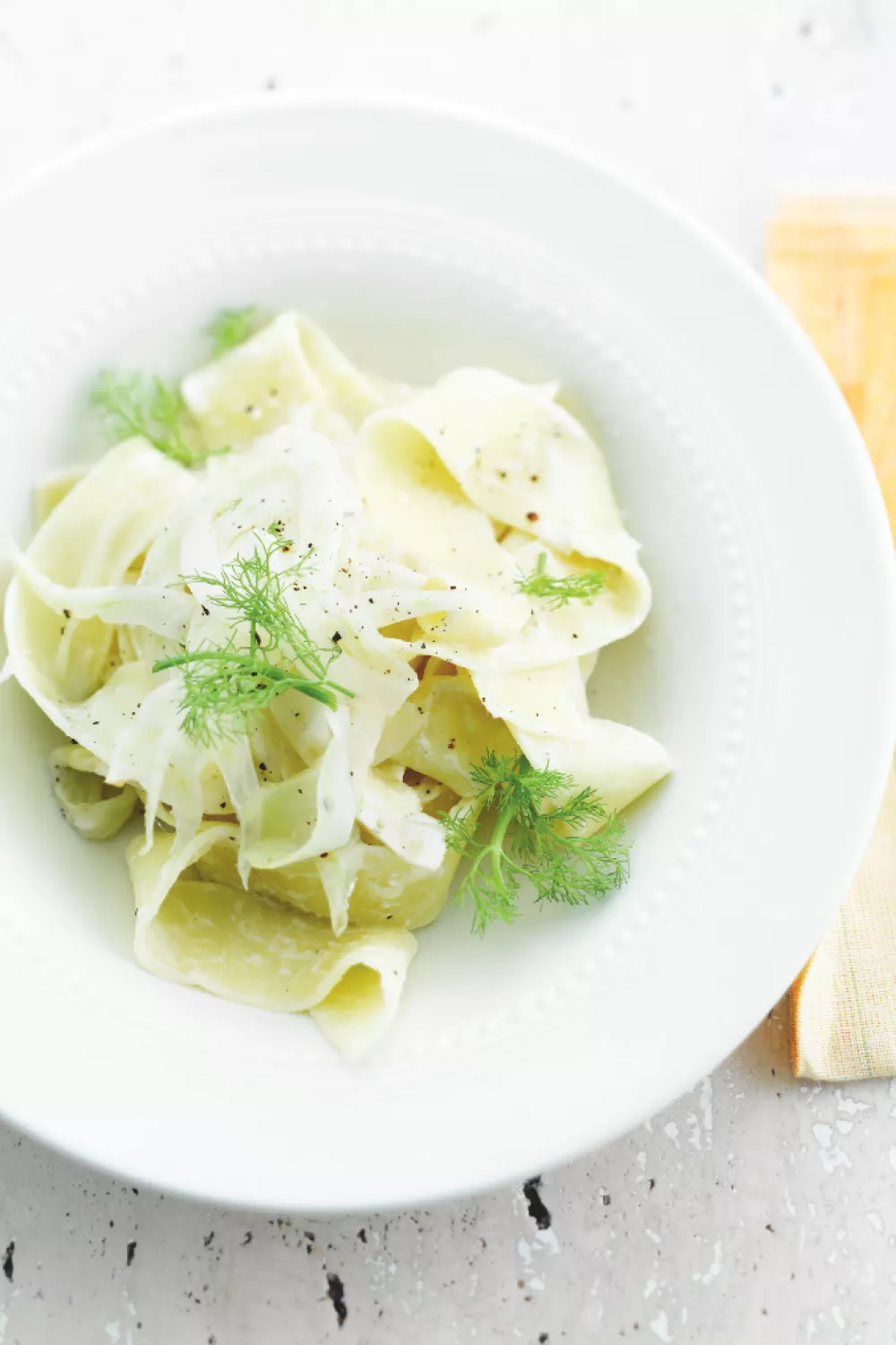 Deze supersnelle pappardelle met drie kazen en venkel combineert romige ricotta, gesmolten Emmentaler en Parmezaan met frisse, licht anijsachtige venkel voor een rijke maar luchtige pastaschotel. Door de venkel kort aan te stoven en de kazen met pastawater te emulgeren ontstaat in enkele minuten een fluweelachtige saus. Perfect als snel comfort food voor doordeweekse avonden of een lichte lente- of zomerlunch.