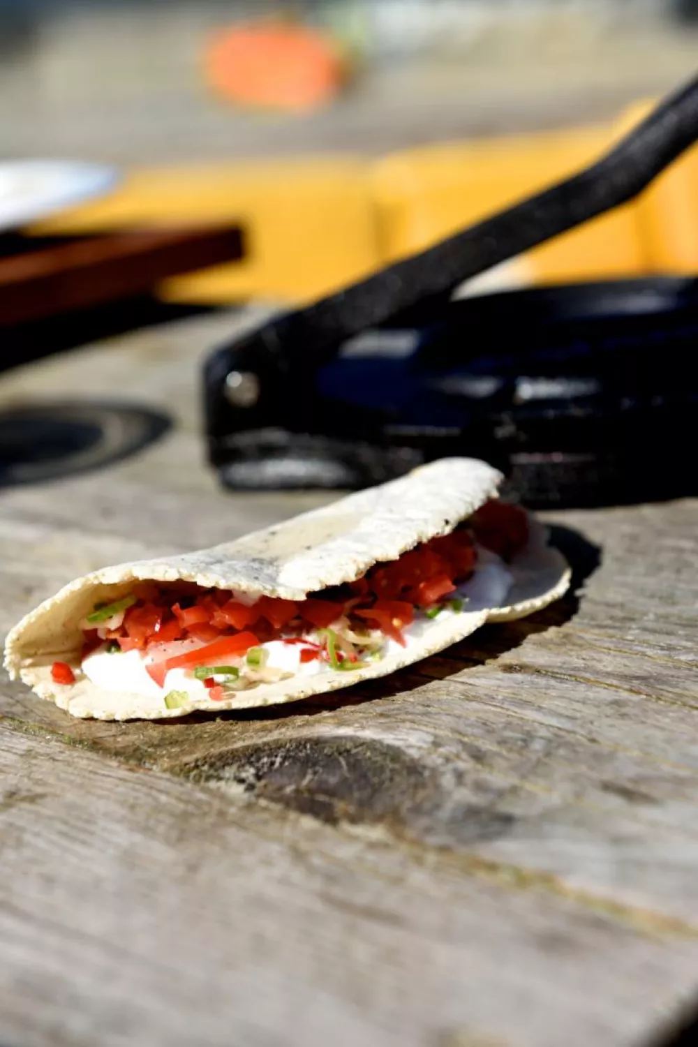 Maak eerst het tacodeeg. Meng de maïsbloem met het water en het zout tot een stevig deegbolletje. Neem een klein stukje van het deeg en draai tot een bolletje. Leg het bolletje tussen twee stukjes plastic of boterpapier en druk plat (bv met de onderkant van een grote pan).
