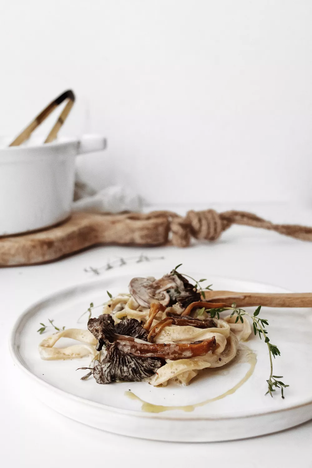 Voeg de pasta toe aan de saus en roer goed door. Doe er een kneepje citroensap bij en breng op smaak met zout en zwarte peper. Serveer met een scheutje truffelolie en wat verse tijm.