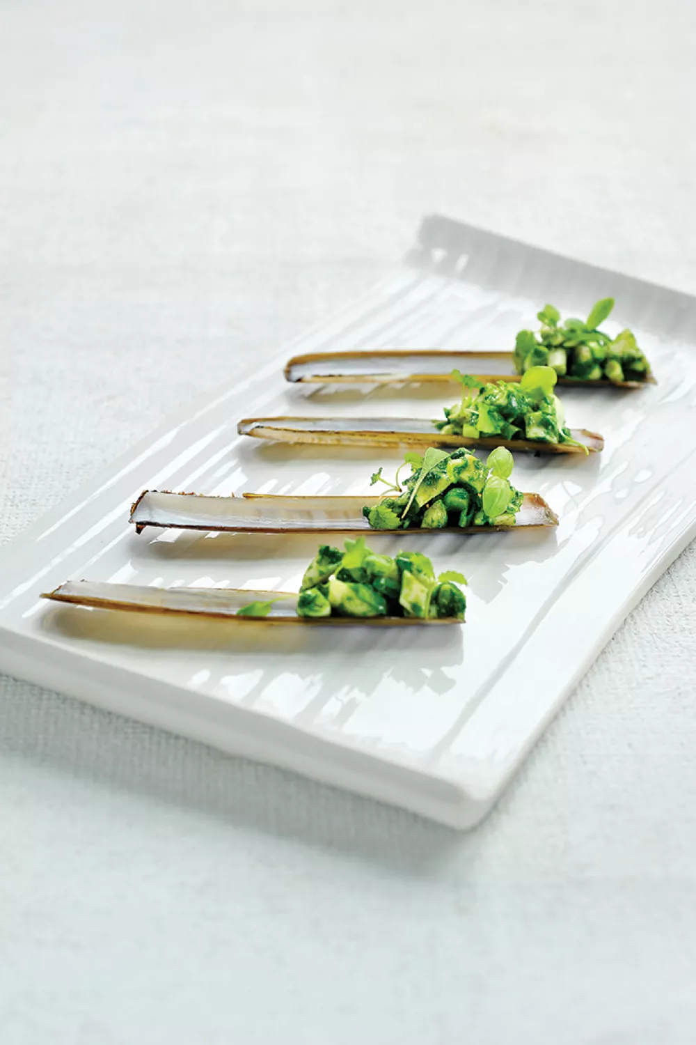 Deze verfijnde tartaar van scheermessen brengt de zilte smaak van zee samen met een frisse crème van peterselie en spinazie en een subtiele toets van knoflook. De scheermessen worden zacht gegaard in olijfolie met rozemarijn, de kruiden kort geblancheerd en tot een fluweelachtige crème gemixt en gezeefd. Afgewerkt met bieslook, lente-ui, mayonaise en venkelbloemetjes is dit een elegant, licht voorgerecht voor een zomers aperitief of een feestelijke starter.