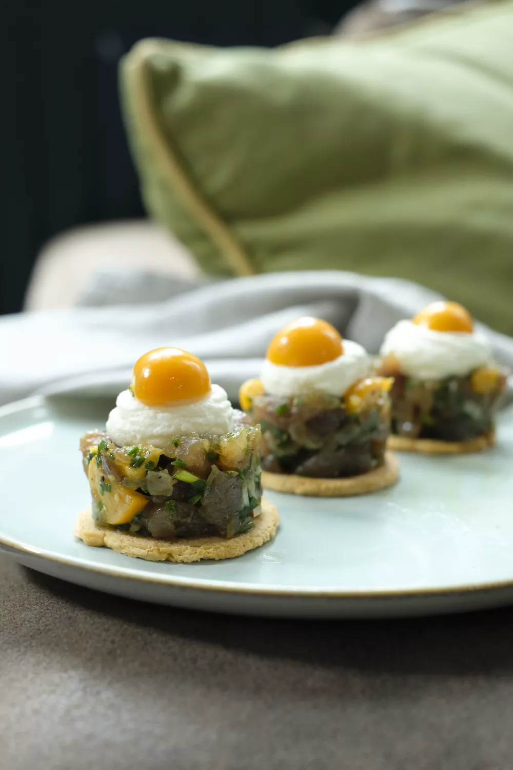 Frisse tartaar van tonijn met een pittige mieriksworteldressing en fruitige physalissen op krokante toastjes brengt een lichte, Aziatisch geïnspireerde smaak op tafel. De rauwe tonijn wordt fijngesneden en gemengd met lente-ui, sojasaus en yuzu voor een umamiaccent, terwijl opgeklopte room met geraspte mierikswortel zorgt voor romigheid en een scherpe afdronk. Perfect als elegant voorgerecht of feestelijke amuse bij een lente of zomerse borrel.