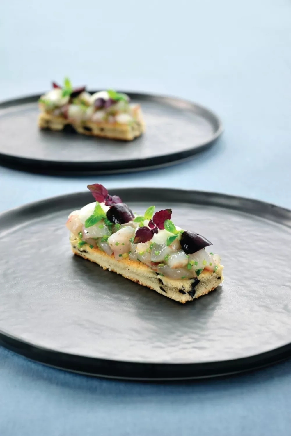 Frisse tartaar van zeebaars op een luchtig olijvenbiscuit met romige mascarpone en limoenrasp is een elegant voorgerecht voor zomerse diners en feestelijke borrels. Het zout van de olijven en de zachte textuur van de rauwe vis vormen een mooi contrast met citrus. Met simpele technieken zoals tartaar fijnsnijden, biscuit bakken en mascarpone spuiten zet je snel verfijnde amuses op tafel.