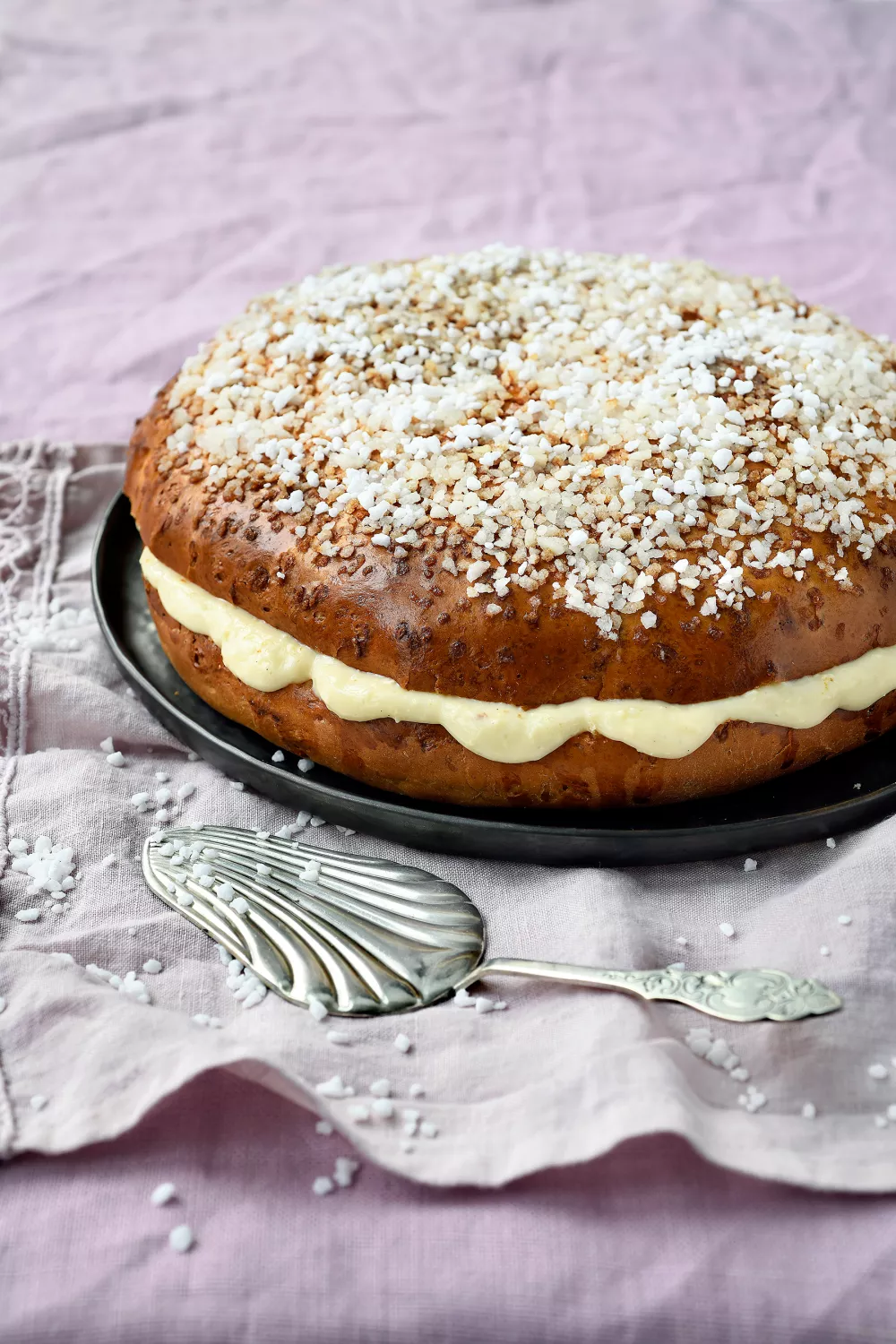 Doreer nu de brioche en besprenkel met voldoende parelsuikertjes. Bak af in een voorverwarmde oven van 200° graden voor circa 30 minuten. Laat afkoelen en snijd de brioche horizontaal doormidden.