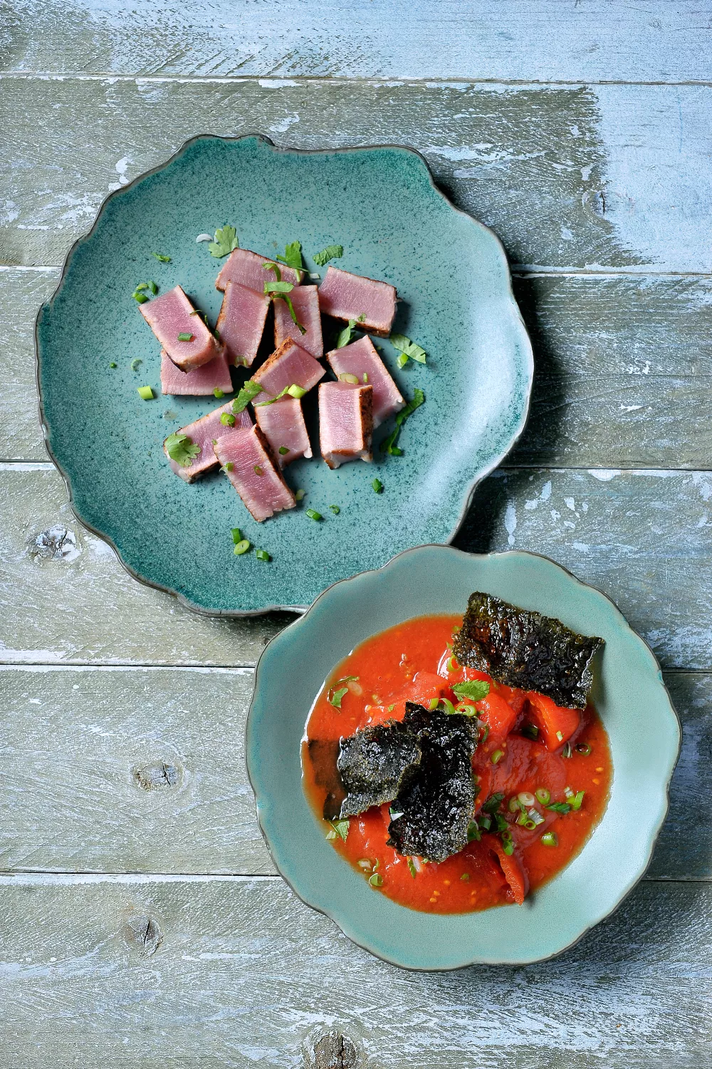 Schep de tomatensalsa op een bord en leper er wat van de saus rond. Schuim het tomatensausje op en lepel het schuim rond de tomaten. Werk het bordje af met de gefrituurde stukjes nori. Snijd de tonijn in fijne plakjes en serveer deze op een apart bordje met de tomatensalsa.