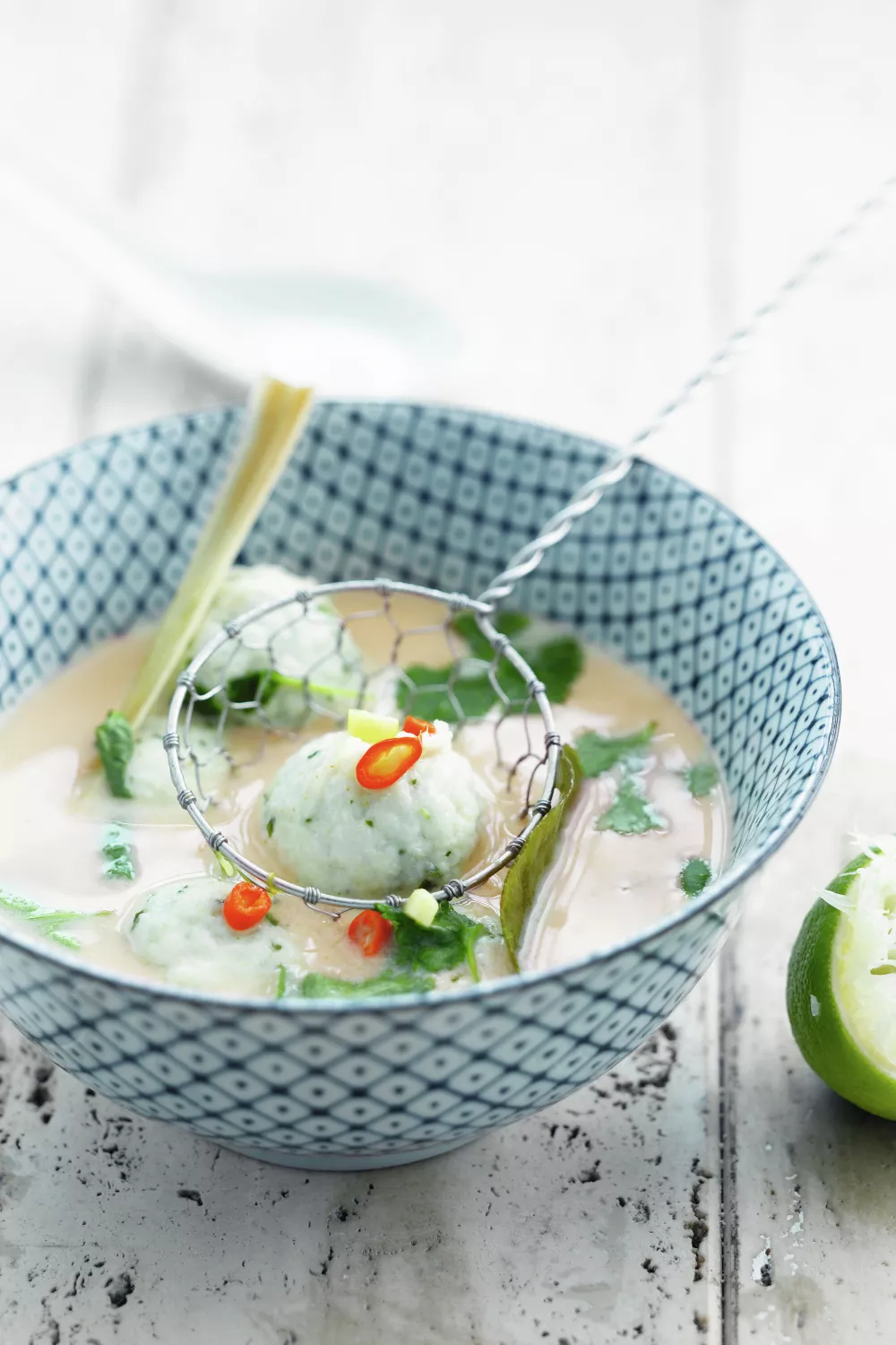 Haal de koriandersteeltjes uit de bouillon en voeg er de kokosmelk, de rode currypasta, kafirblaadjes en visballetjes aan toe. Breng terug aan de kook en laat 5 min. koken.