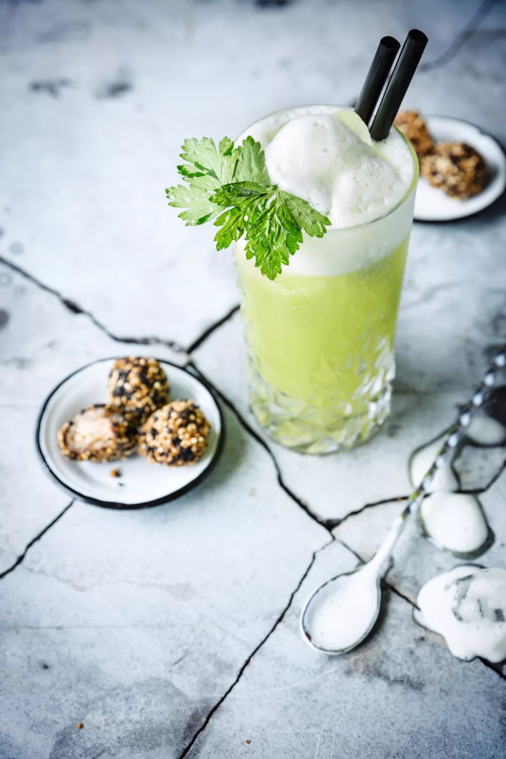 Een frisse, groene borrelcombinatie van een appel met kruiden cocktail en knapperige scampi’s, ideaal als feestelijk aperitief of zomerse borrel. De cocktail van Granny Smith appels, sjalot en platte peterselie wordt kort geblend, gezeefd en dry geshaked met eiwit en optionele wodka voor een schuimige, pittige toets. De scampi’s worden fijngemalen tot balletjes gerold, door sesam gehaald en krokant gefrituurd voor een hartige crunch.