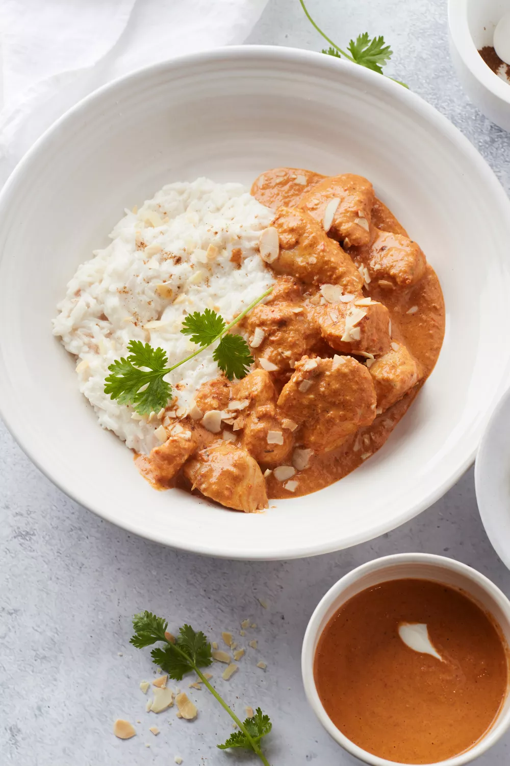 Serveer de tikka masala met de kokosrijst. Werk af met geroosterde amandelschilfers en enkele blaadjes verse koriander.