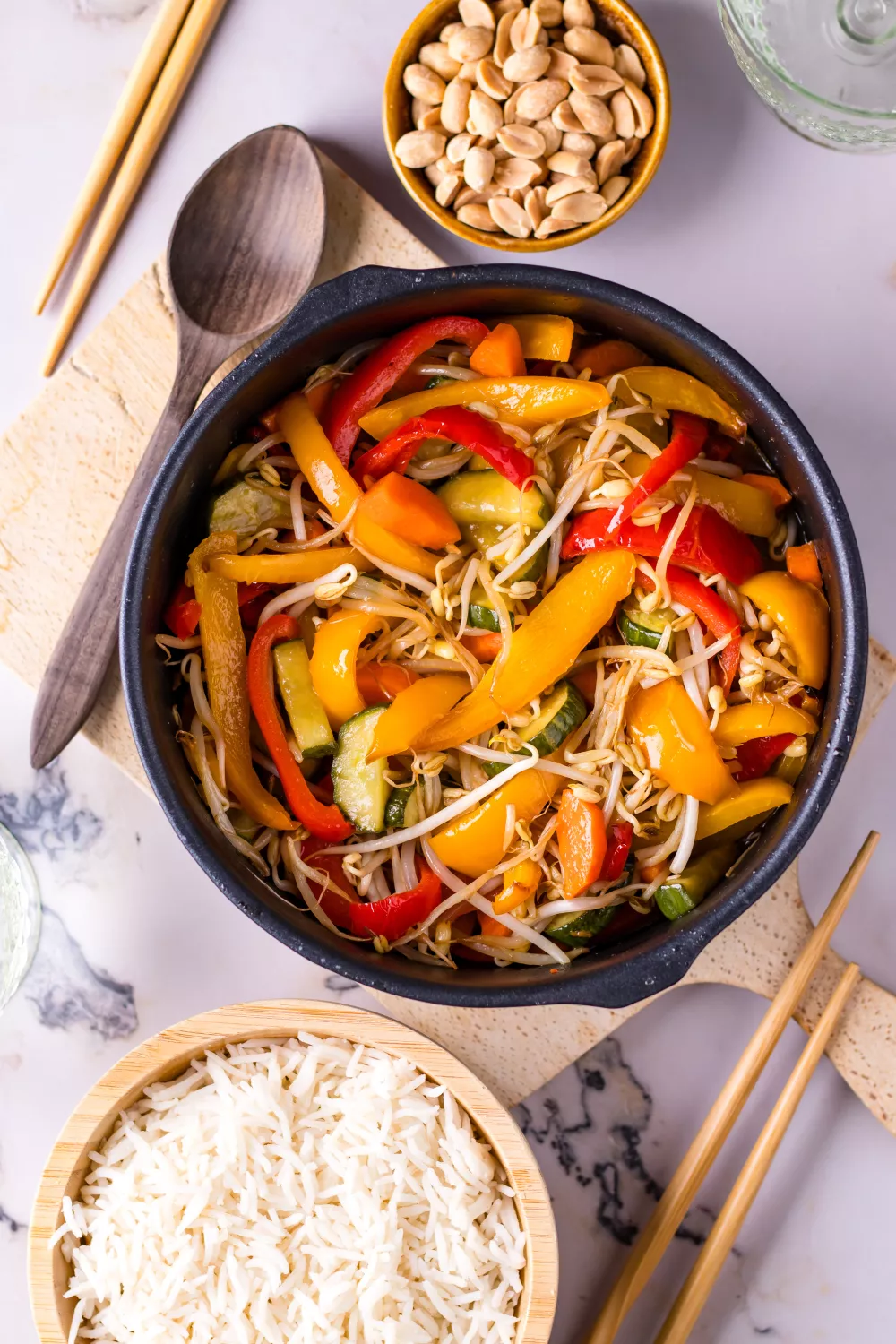 Knapperige, kleurrijke tjap tjoy met gele en rode paprika, wortel, komkommer en sojascheuten, met een lichtzoete touch van ketjap manis en sojasaus. Door te bakken in de airfryer krijgt de groentemix snel die roerbakachtige textuur met weinig olie. Ideaal als snelle vegetarische maaltijd of zomers bijgerecht voor doordeweekse avonden.