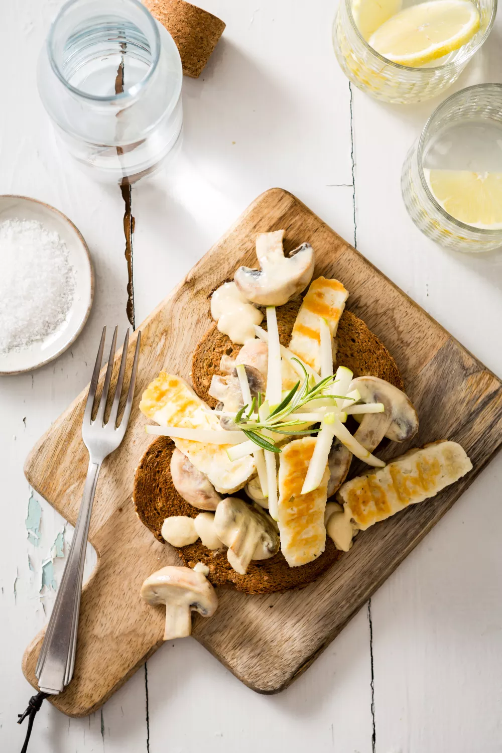 Schik de toasts op borden. Schik er de halloumiplakjes en de champignons op. Werk af met de snippers appel.