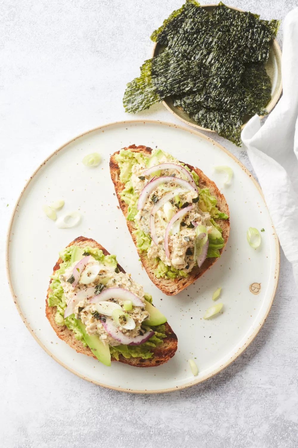 Deze frisse vegan toast combineert romige avocado met een umami-rijke kikkererwtensalade op basis van nori, vegan mayonaise en limoen. In de blender maak je in enkele minuten een smeuïge, tonijnachtige textuur die je op warm geroosterd brood smeert voor een snelle lunch of zomerse brunch. Selderij en sjalot zorgen voor knapperigheid en frisheid, waardoor dit plantaardige eiwitrijke gerecht perfect is als hartige snack of licht diner.