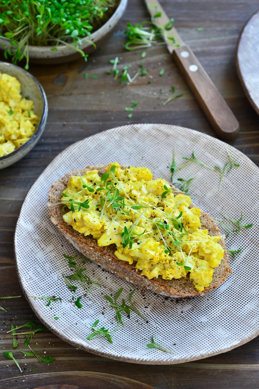 Romige eiersalade met een frisse beet van appel en een warme currytoets op krokante toast van bruin brood is perfect voor een snelle lunch of lichte brunch. Gekookte eieren worden met mayonaise en Griekse yoghurt romig gemaakt en op smaak gebracht met currypoeder en kurkuma en aangevuld met fijngehakte bladpeterselie. Afgewerkt met knapperige appelblokjes en een handvol cresson voor extra frisheid, ideaal voor lente en zomerse maaltijden.