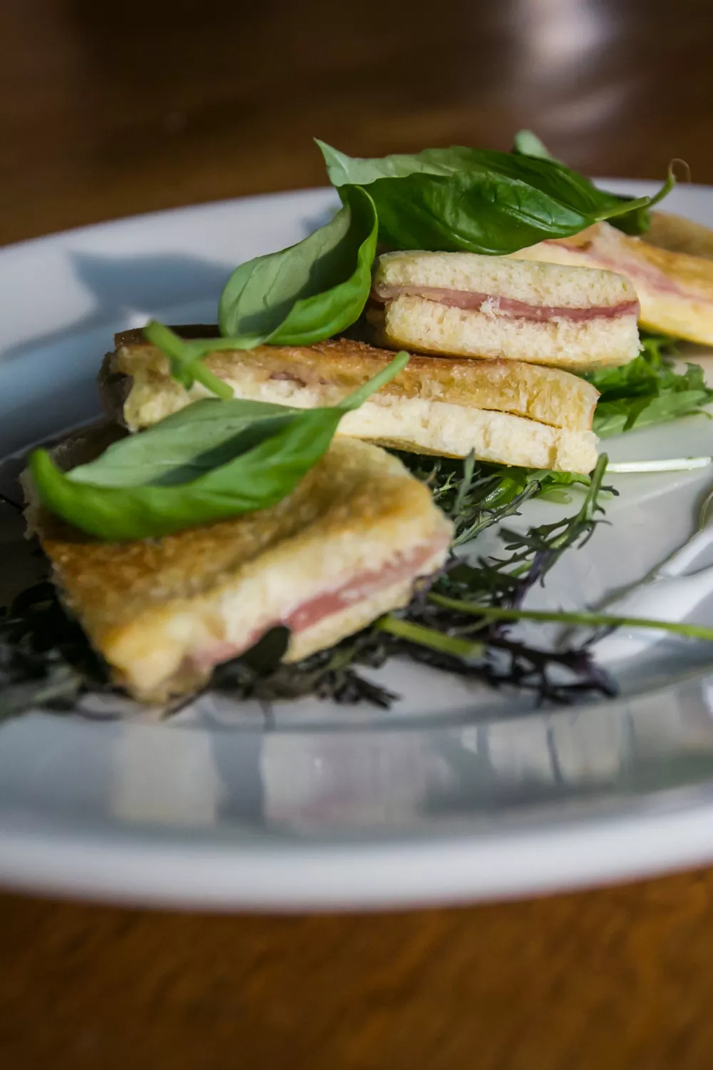 Beleg de helft van de sneetjes briochebrood met de gedroogde ham en de mozzarella. Schaaf er Parmezaanse kaas over en eventueel verse truffel (of besmeer met truffeltapenade). Bedek met de overige sneetjes briochebrood en snijd (indien gewenst) de korstjes van het brood.