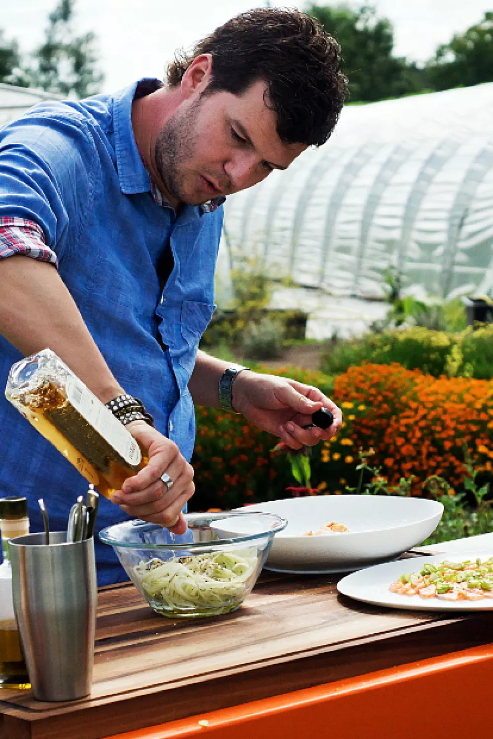 Meng de plattekaas met de gesnipperde sjalot en bieslook en breng op smaak met peper en zout.