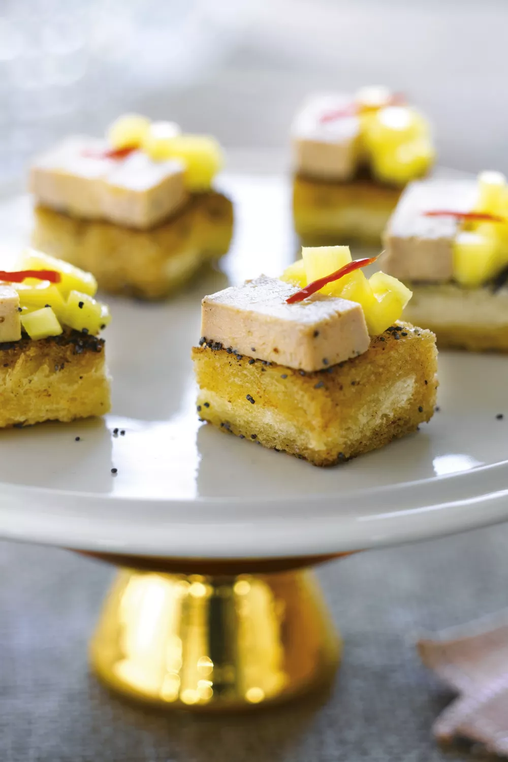 Deze feestelijke toastjes combineren rijke ganzenlever met frisse mango en een knapperige korst van maanzaad, perfect als elegant aperitief of borrelhapje. Het brood wordt een nacht geperst onder gewicht en daarna goudbruin gebakken in pittige chiliboter, waardoor zoete en hartige smaken mooi samensmelten. Werk af met fijne reepjes chili voor kleur en een subtiele pittigheid.