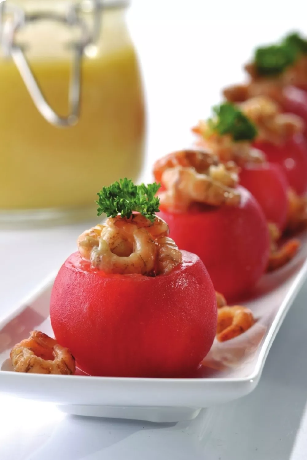 Romige gevulde tomaten met garnalen zijn een licht en feestelijk voorgerecht waarin zongerijpte tomaten en zilte gepelde grijze garnalen samenkomen. De tomaten worden kort geblancheerd en gepeld en vervolgens rijk gevuld met garnalen gemengd met mayonaise, een scheutje citroen en verse krulpeterselie. Ideaal als zomerse lunch, elegant aperitief of bij een gezellige borrel.