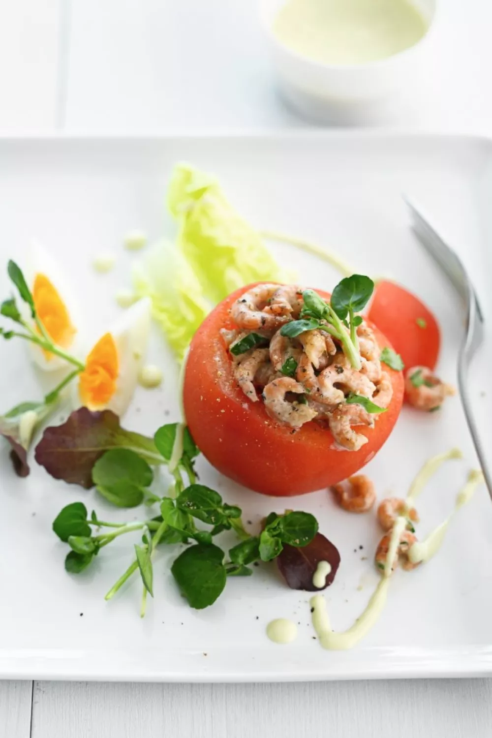 Gevulde tomaten met handgepelde grijze garnalen en romige huisgemaakte mayonaise zijn een licht en smaakvol voorgerecht, ideaal voor zomerse lunches, picknicks of een elegante borrel. De tomaten worden kort geblancheerd en uitgehold, de mayonaise gemaakt met de staafmixer en de garnalen zachtjes gemengd met ei en peterselie. Serveer op een bedje van krop sla en rode lolo voor een frisse, kleurrijke presentatie.