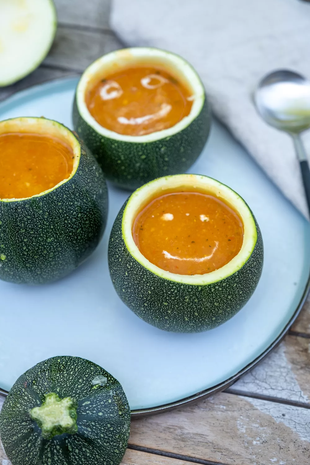 Romige tomatensoep met courgette en prei, geserveerd in uitgeholde bolcourgettes voor een frisse, zomerse toets. De smaak komt van zoete Toma'Gusto tomaten, gestoofde ui en knoflook en het courgettevlees dat zachtjes in kokosolie gaart, op smaak gebracht met tijm en een scheut plantaardige room. Perfect als licht vegetarisch voorgerecht of zomerse lunch bij een gezellig etentje.
