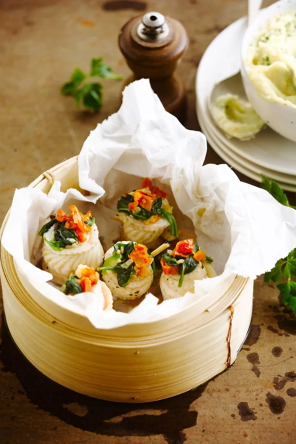 Stoom de tongrolletjes in een stoommandje en serveer met een romige aardappelpuree.