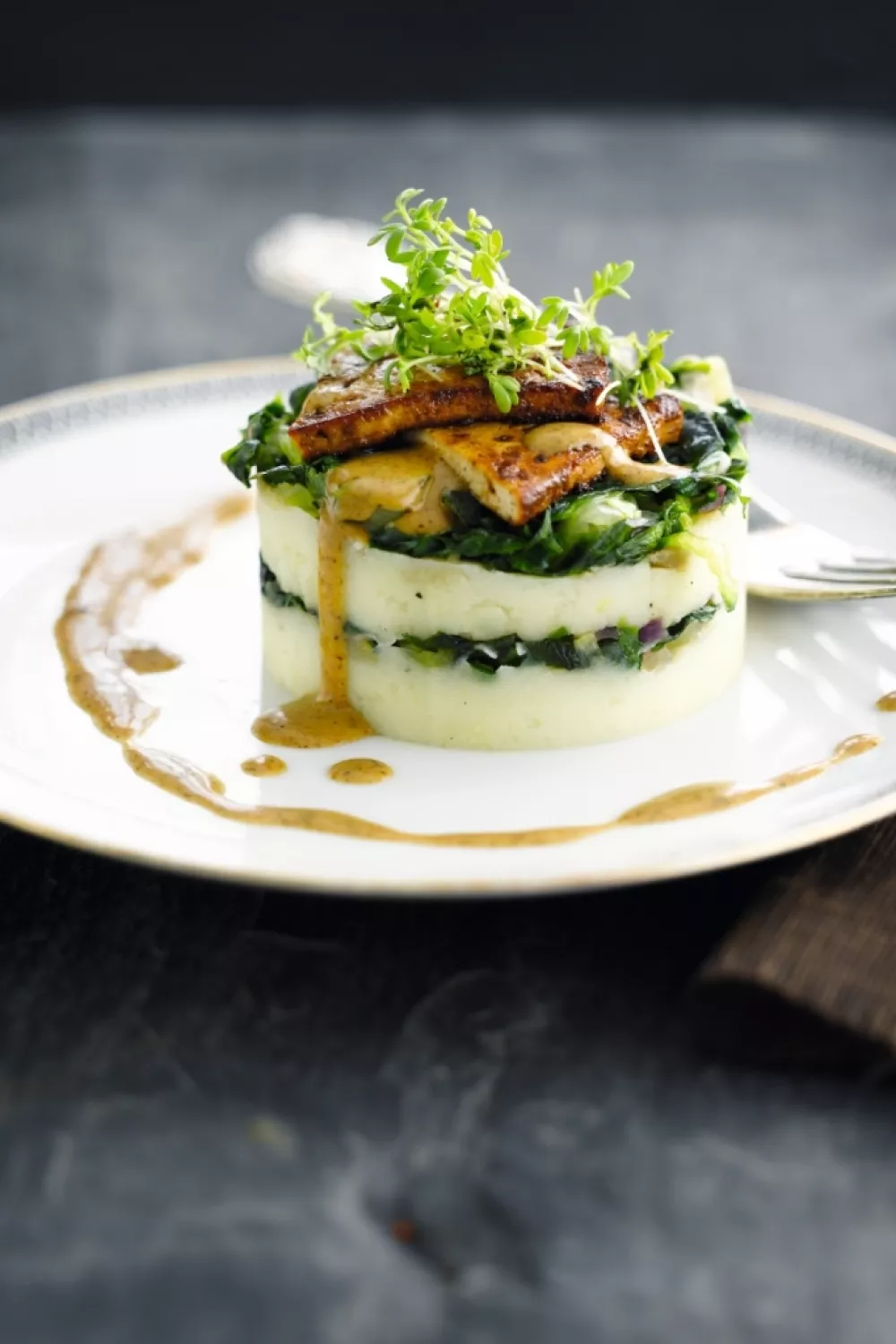 Maak een torentje van de puree en wissel af met de andijvie. Leg er enkele plakjes tofu op.