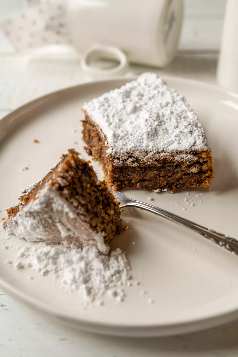 Verdeel het beslag over een ingevette, ronde springvorm van +- 20 cm. Bak de taart +-40 minuten op 170°C. Wanneer de taart is afgekoeld kan je hem ontvormen en bestrooien met poedersuiker.