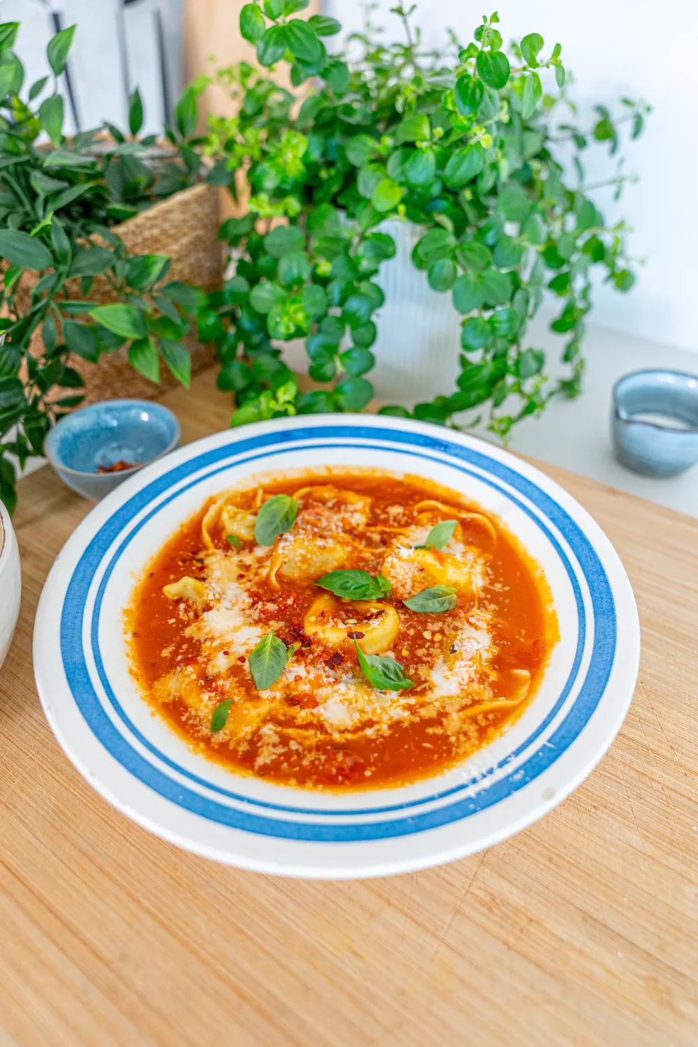 Romige tortellinisoep met sappige kerstomaatjes en geraspte Parmezaan, ideaal als troostrijke doordeweekse maaltijd of gezellige herfstsoep. Je stooft sjalot en knoflook aan, mengt de groentenbouillon met pastasaus en laat de tortellini enkele minuten garen tot ze boven komen. Afgewerkt met een scheut room, verse basilicum en een snuf chilivlokken levert dit snel comfortfood met Italiaanse smaken.