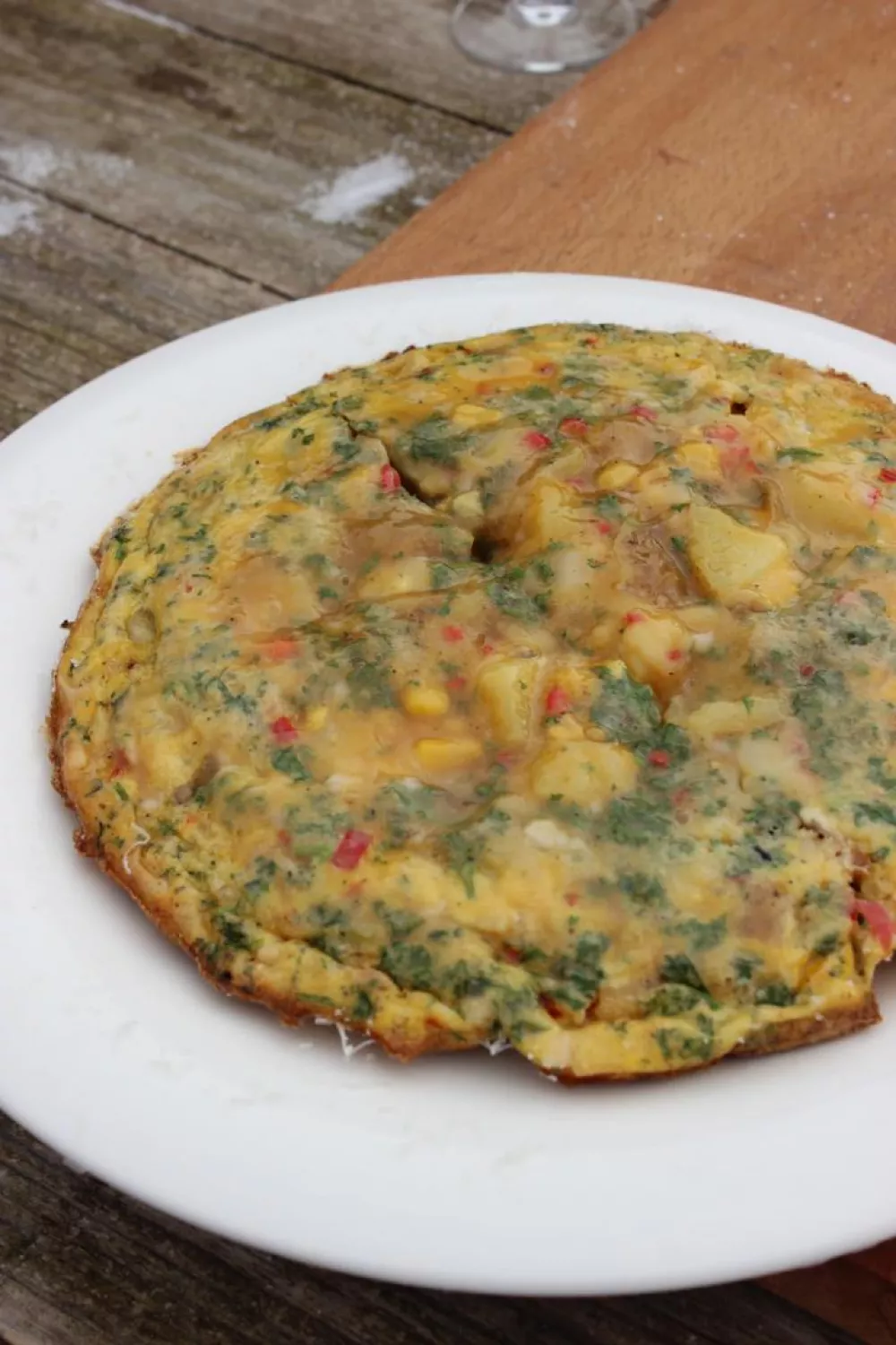 Deze luchtige tortilla met zoete maïs, blokjes aardappel en een pittig vleugje rood chilipepertje is ideaal voor een zomerse barbecue of als eenvoudig borrelhapje. De eieren worden losgeklopt met peterselie en Parmezaanse kaas en in een wok op de barbecue goudbruin gebakken, wat een lekker rokerige, hartige smaak geeft. Werk af met extra geraspte Parmezaan en serveer warm.