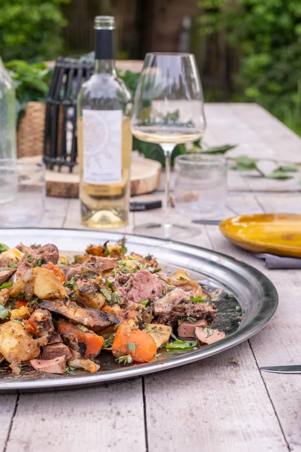 Dit traag gegaarde geitenvlees, gevuld met hete saunastenen en grof gesneden groenten, levert een robuuste, rokerige smaak en heerlijk mals vlees. Met een kruidige rub van venkel, komijn, paprika en kaneel krijgt het gerecht mediterrane en oosterse tonen. Perfect voor een winterse feestmaaltijd of een stoere open vuur barbecue.