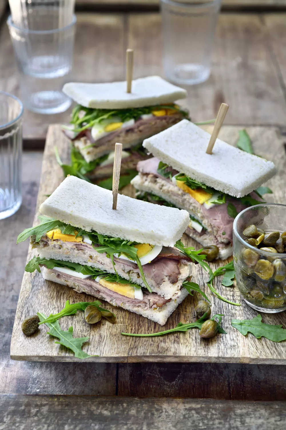Snij het tramezzinobrood in gelijke stukken. Beleg een schijfje brood met de tonijncrème, doe er een stukje rosbief op, een beetje rucola en 2 schijfjes hardgekookt ei. Leg daarop opnieuw een schijfje brood en doe hetzelfde. Dek af met een laatste sneetje tramezzino. Steek er een prikker door om alles op zijn plaats te houden.