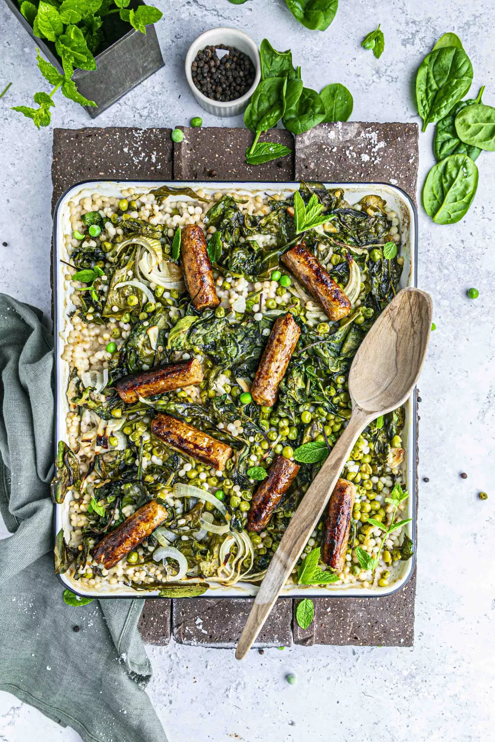 Traybake met parelcouscous, vegan worstjes, erwten en spinazie en munt