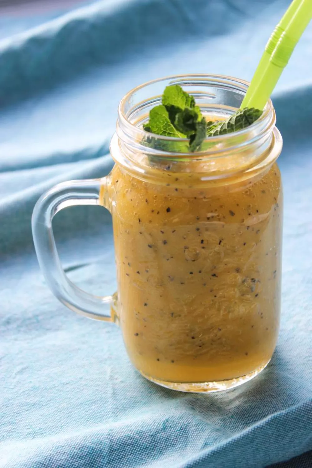 Serveer de smoothie in een glazen bokaaltje met een rietje en een takje munt.