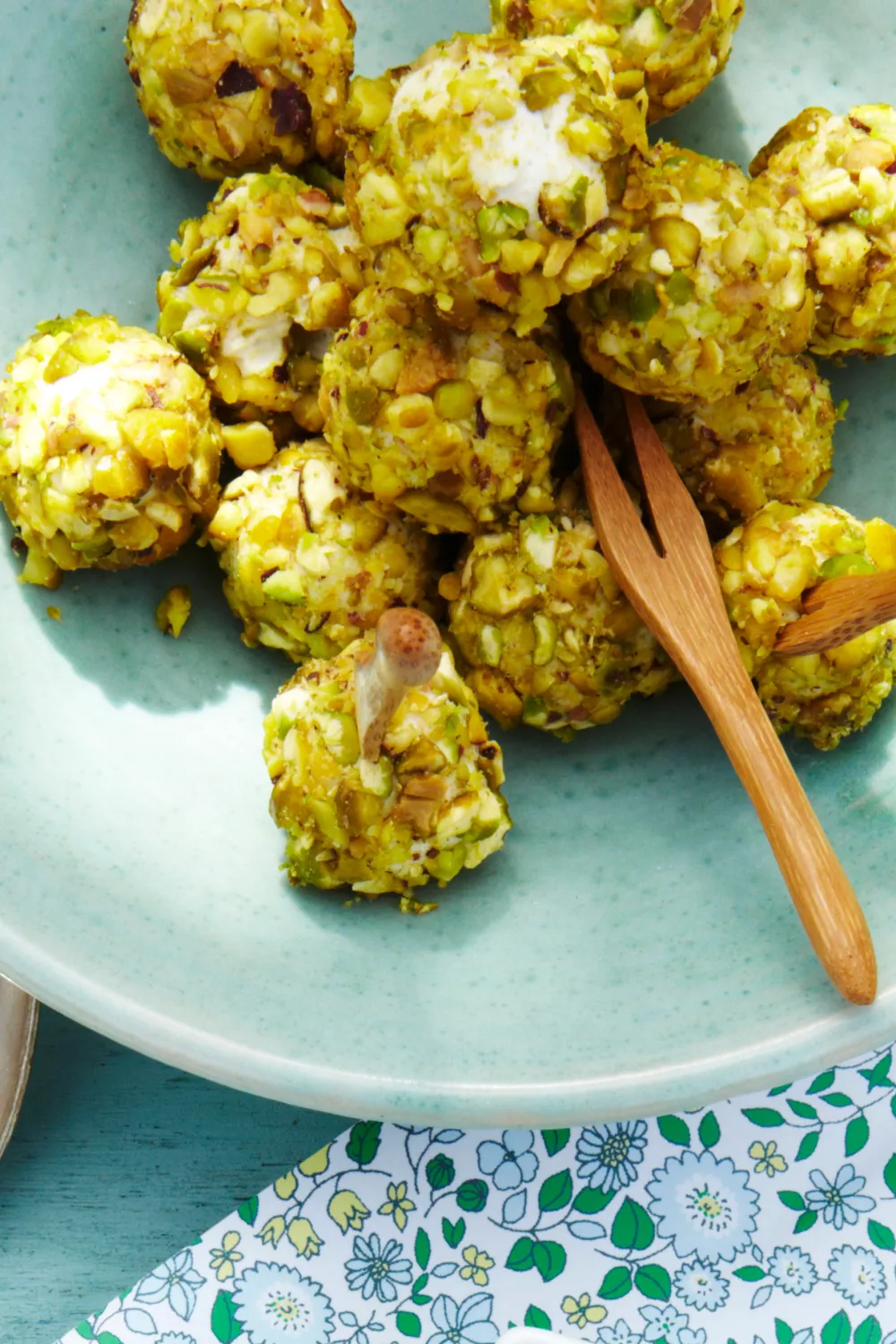 Rol balletjes van de kaas en rol ze door de pistachenoten. Laat ze opstijven in de koelkast.