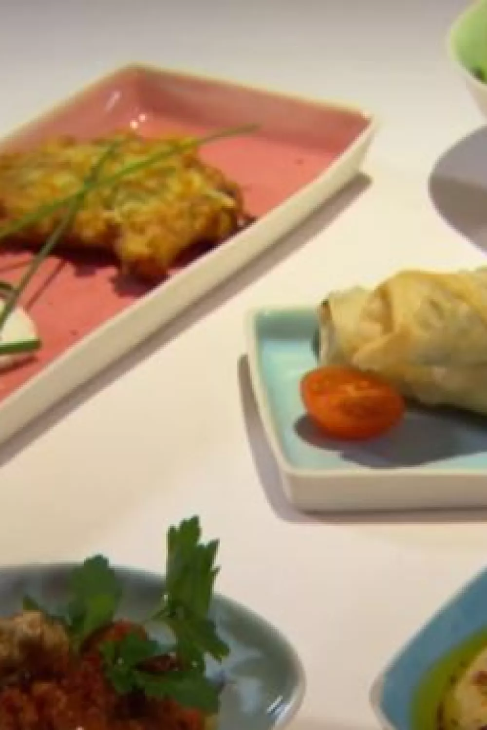 Deze Turkse mezze schotel combineert romige kikkererwten met tahin, gegrilde paprika en aubergine, krokante fetapakketjes in filodeeg, smeuïge courgettinkoekjes en pittig gefrituurde kalfslever. Door te pureren, grillen en frituren creëer je een kleurrijk en hartig voorgerecht dat perfect is voor een zomerse borrel of uitgebreid familiediner. Zachte, kruidige smaken en knapperige texturen wisselen elkaar af voor een feestelijke en authentieke mezzebeleving.